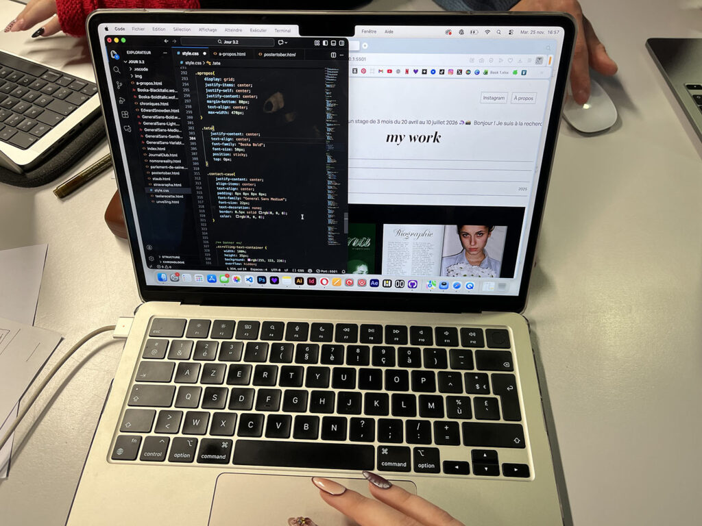 Les étudiants du DNMADe IC 2 (promo 2027) ont profité d’un workshop de quatre jours avec Benoît WIMART, autour des langages HTML, CSS et JavaScript pour réaliser leur books professionnels en ligne. Benoît WIMART vit à Amiens, où il exerce en tant que designer graphique et enseigne à l’ENSAD d’Amiens.https://jaiunsite.com/ Les sites des étudiantes et …